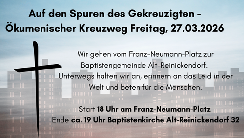 Wir treffen uns um 18 Uhr am Franz-Neumann-Platz und gehen von dort aus die Residenzstraße entlang bis zur Baptistengemeinde Alt-Reinickendorf. Unterwegs halten wir an um zu beten, Texte zu hören und gemeinsam zu singen. Wir erinnern an das, was Jesus erlitten hat und was Menschen bis heute erleiden und beten um Gerechtigkeit und Hilfe. Nach dem Kreuzweg gibt es noch die Möglichkeit zusammenzubleiben.